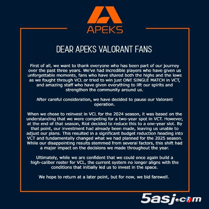 前臨時(shí)席位隊(duì)伍Apeks宣布暫停無(wú)畏契約項(xiàng)目的運(yùn)營(yíng),原文大致翻譯如下: