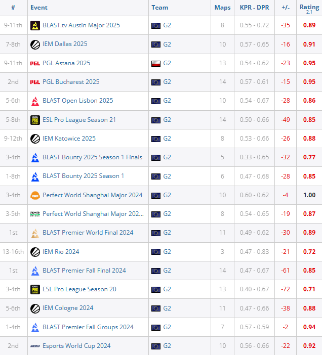 2025年7月11日,G2俱樂(lè)部正式將波蘭指揮Janusz "Snax" Pogorzelski移出主力陣容,結(jié)束其為期373天的服役生涯。這位32歲老將雖在初期率隊(duì)斬獲2024 BLAST秋季總決賽和全球總決賽冠軍,但HLTV數(shù)據(jù)顯示其參與的18項(xiàng)賽事所有關(guān)鍵數(shù)據(jù)均呈負(fù)增長(zhǎng),175張地圖平均Rating僅0.88,僅34.9%場(chǎng)次達(dá)到1+Rating標(biāo)準(zhǔn)。
